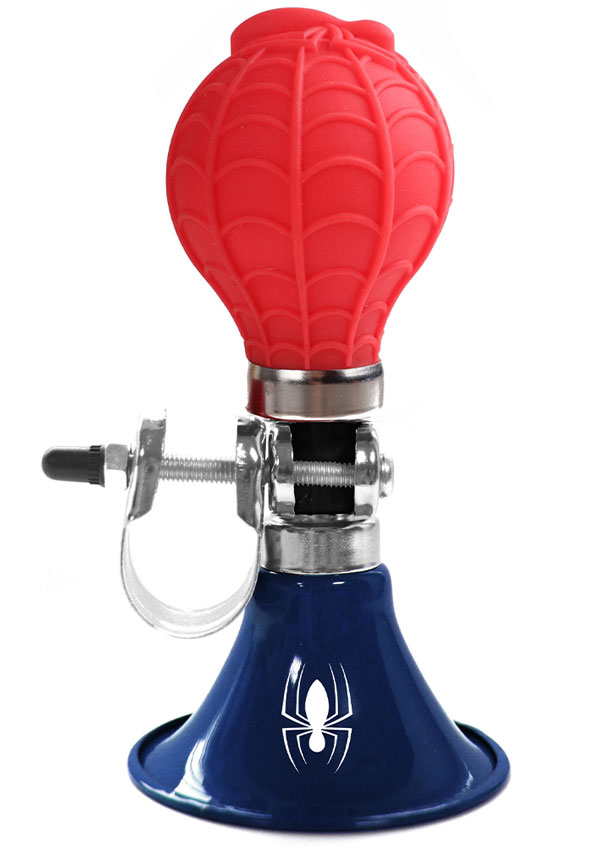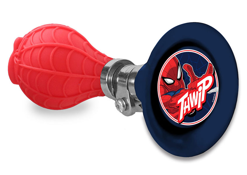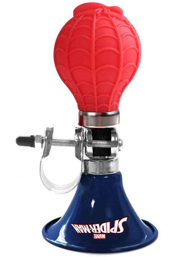 En cykeltuta som utger ett högt ljud och är dekorerad med spännande motiv frånSpindelmannen.