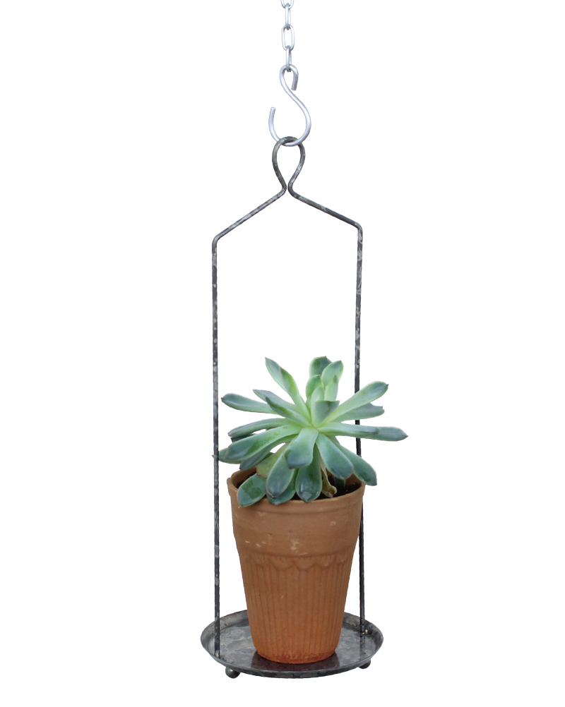 En hög hängande hylla eller ställning till en liten kruka eller vas, från Strömshaga. Den är tillverkad i järn och har en antik zinkfinish.Ställningenfinns att köpa i två olika storlekar (båda säljs separat) och är fina att kombinera och hänga på olika höjd (hänganordning ingår ej, köp själv passande kedja och s-krok). Denna ställning har en diameter på 9,5 cm och en höjd på 32 cm. Den gör sig fin både hängandes från tak eller fönsterkarmar och som ståendes på bord eller andra plana ytor. Ställ en vacker krukväxt eller en vacker vas med snittblommor i ställningen. Om du har en klätterväxt kan du låta den slingra sig upp längs ställningen.