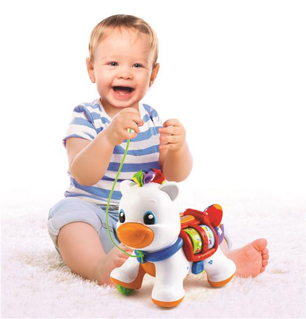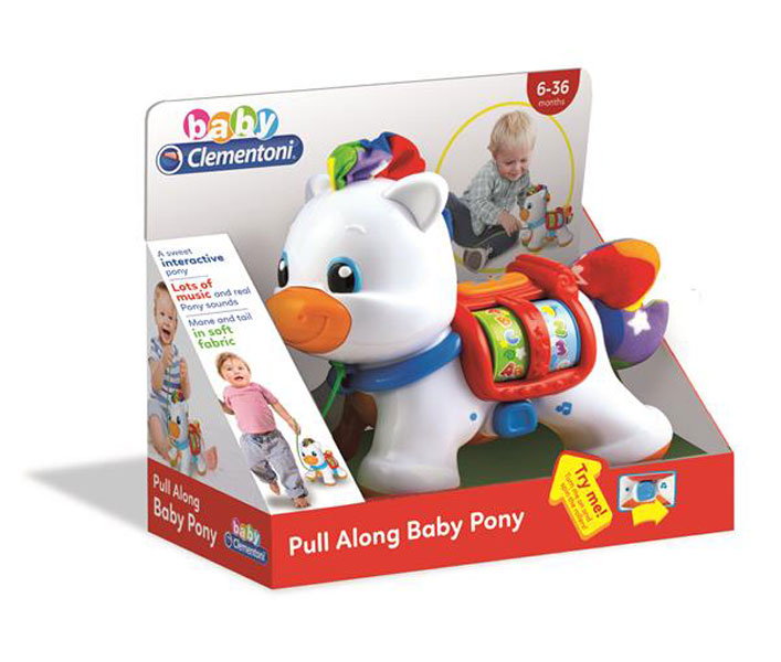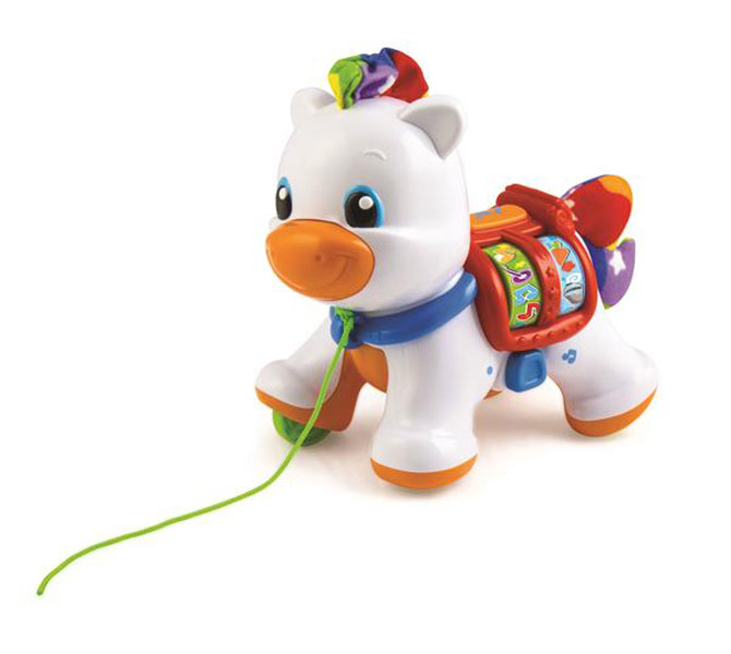 Det här söta dragdjuret är i form av en gullig baby pony och det har ett snöre så att ditt barn kan dra med sig sin favoritleksak vart dem än ska. Hästen har massor av roliga ljudeffekter och den spelar musik när den rör sig eller när de två rullarna på dess mage snurrar. Hästens svans och man är tillverkade i mjukt tyg för att stimulera barnets känsla av beröring. Den uppmuntrar ditt barn när det tar sina första steg och det blir en rolig stund. Med sina många effekter kommer den få ditt barn att skratta!