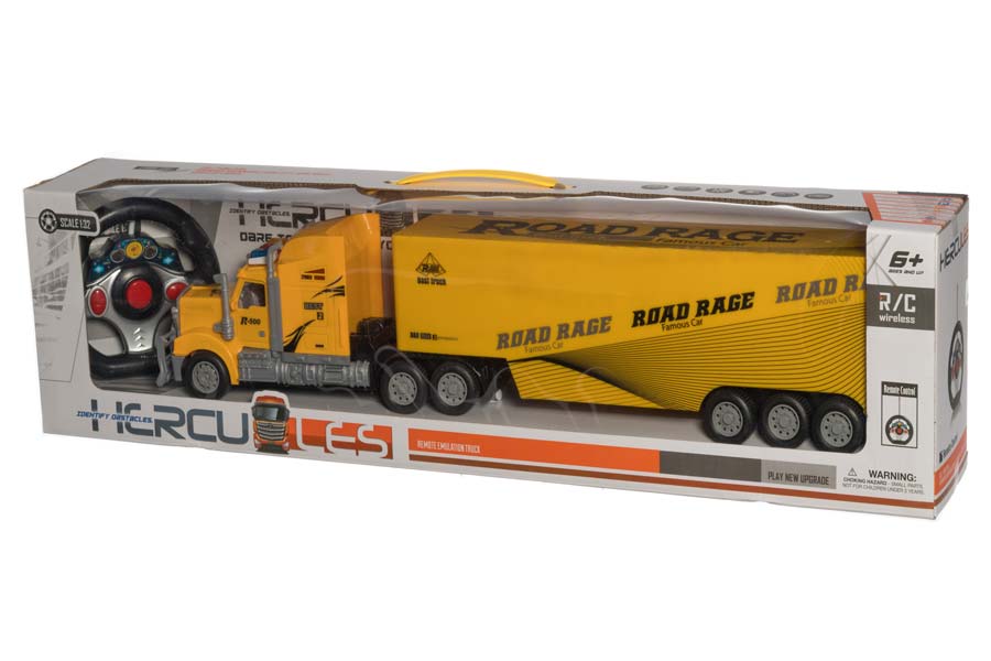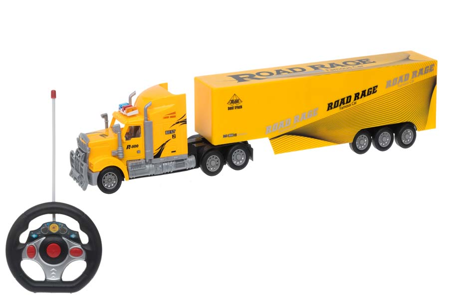 En radiostyrd tung lastbil med handkontroll och lyse, redo att följa med på äventyr!