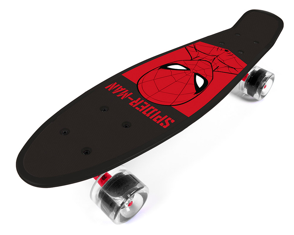 En svart pennyboard/skateboard i plast för barn med motiv från Spindelmannen. Pennyboarden har motiv på ovansidan. Pennyboards är bland de mest populära typerna av skateboards som finns på marknaden. Denna skateboard har en längd på55cm /21.6 ” och är mycket bekväm att åka på.De breda och mjuka polyuretanhjulen dämpar vibrationer och säkerställer komfort under åkning.Högkvalitativa, lätta ABEC-7-hjul är en garanti för smidighet och hastighet under åkning. Ett perfekt hjälpmedel att glida runt på.