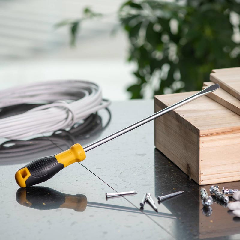 En bekväm och högkvalitativ spårskruvmejsel från Deli Tools. Det gula handtaget är tillverkat av tålig plast och har ett hål i toppen av handtaget så att du lätt kan hänga upp verktyget på till exempel en verktygstavla. Skruvmejseln är dessutom utrustad med en magnetisk spets, ett lyx som underlättar arbetet och som man inte kan tänka sig att leva utan när man väl vant sig vid det!