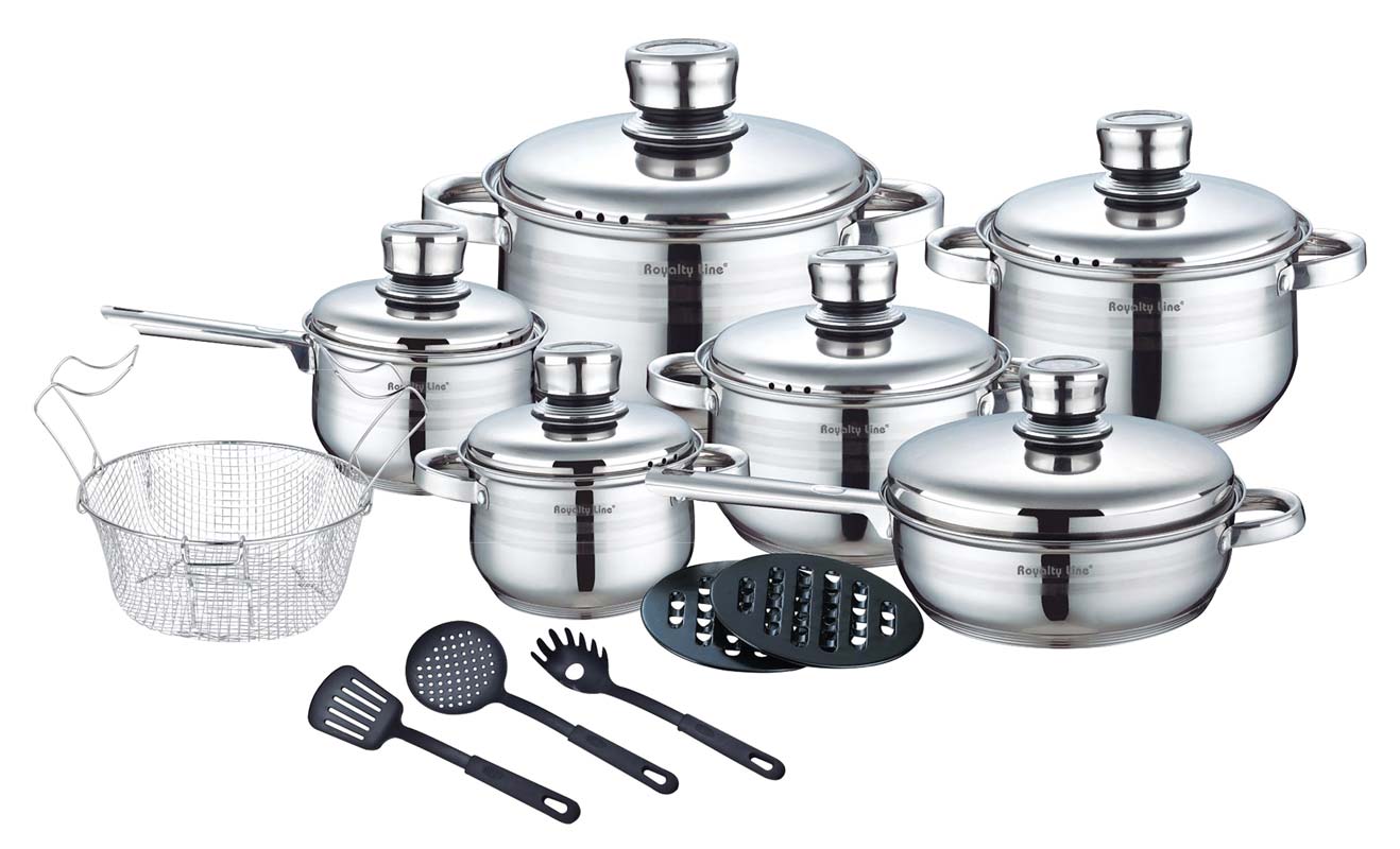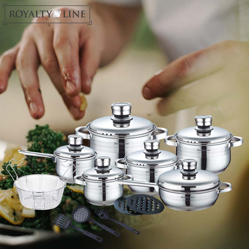 Ett stort köksset från Royalty Line. Med detta stora köksset kan du förbereda flera rätter för din familj och vänner. Detta set består utav 18 delar i rostfritt stål. Alla kokkärl har en 5-lagers bas med hög värmeledningsförmåga som håller värmen mycket länge. Alla delar i detta set kan diskas i diskmaskin förutom locken vilket gör rengöringen efter användning mycket snabb och enkel.